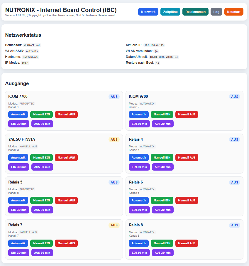 Die Hardwarebasis bildet ein kostengünstiges Relaisboard mit integriertem ESP32-Controller. Die mitgelieferte Software erwies sich als wenig brauchbar, sodass eine eigene Lösung entwickelt wurde. Dank der Unterstützung durch die Arduino-IDE und frei verfügbare Libraries konnte die WLAN-Anbindung sowie die Steuerlogik effizient umgesetzt werden.